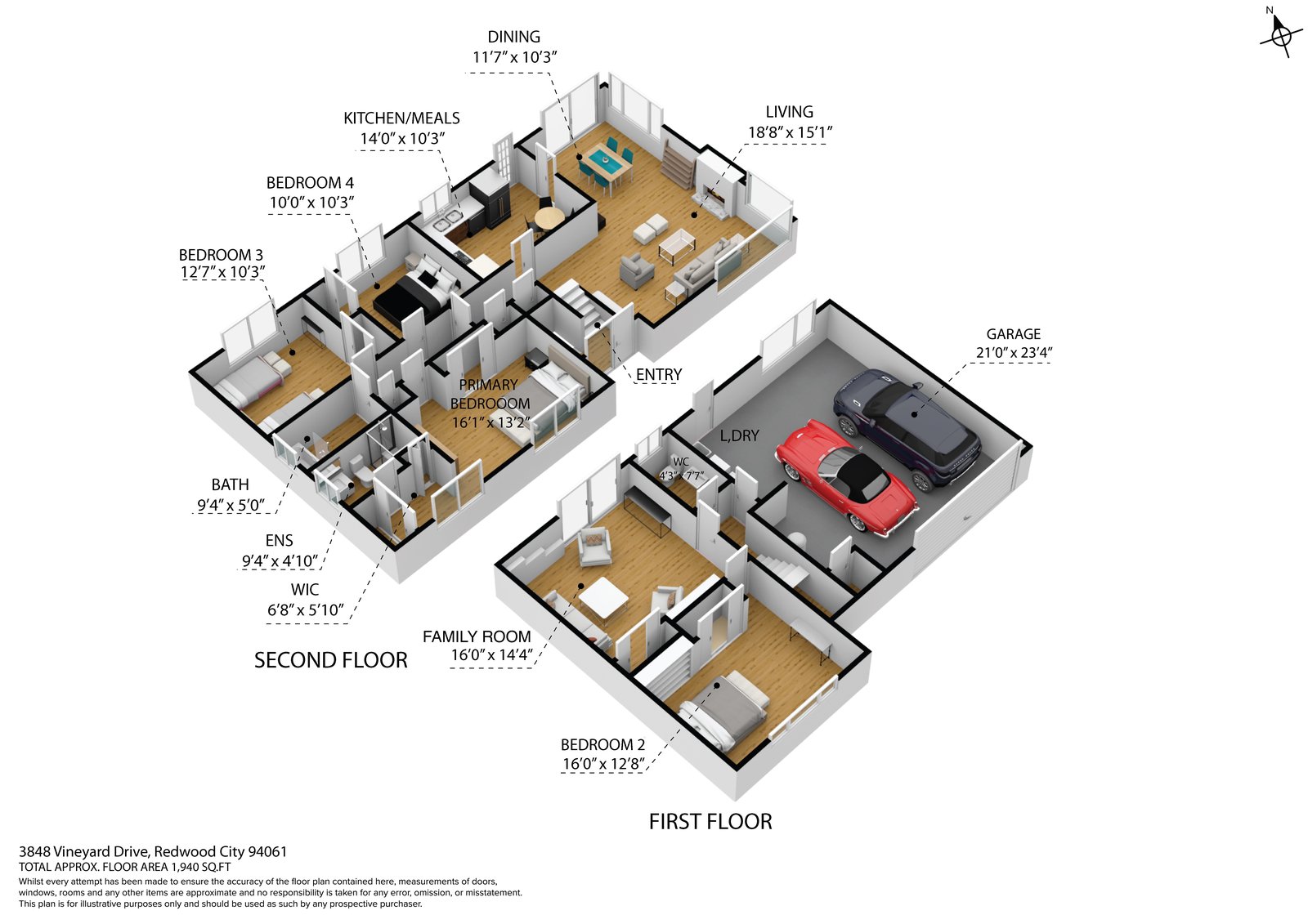 Beautiful Farm Hill home featuring captivating views from multiple rooms. Just a short walk to Roy Cloud K8 and Stulstaff Park. The home showcases pristine, light-filled hardwood floors throughout. Enjoy a spacious living room with expansive windows overlooking the city, and a warm, inviting family room that opens directly to the backyard and garden areas. The upper level includes a primary suite and two additional bedrooms, while a fourth bedroom is conveniently located downstairs off the family room. A formal dining room leads out to an expansive deck with sweeping views that flow into the upper yard. The roses, landscaped gardens, and stonework create a truly enchanting outdoor retreat. Flooded with natural light, this home is one you must experience in person. The peaceful, tree-lined street adds to its charm. Only a 2-minute drive to the 280 on-ramp and just minutes from downtown Redwood City.